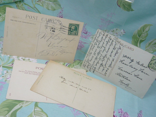 one has been left blank, one has been written on , whilst the Art Deco scene has been written on and stamped in USA dated 1924 and the sweethearts stamped also with vintage stamps on which just adds to their appeal
