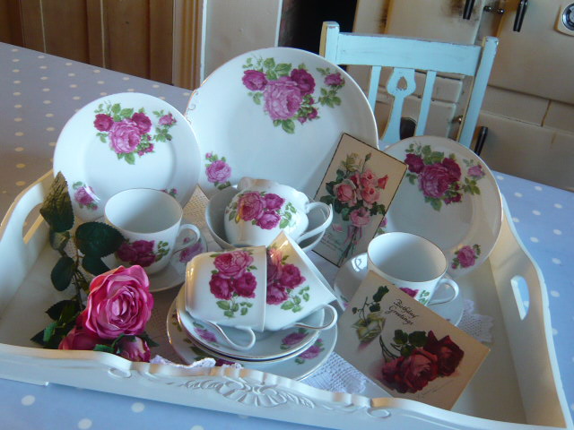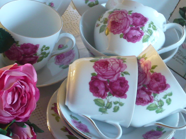 Features such a pretty design of crisp white background with such pretty pink roses.........a floral delight !!