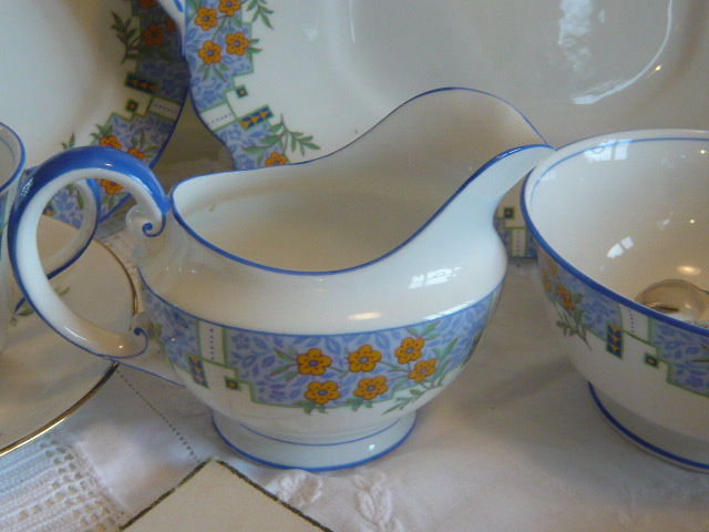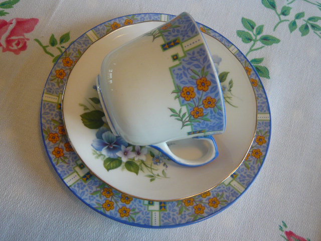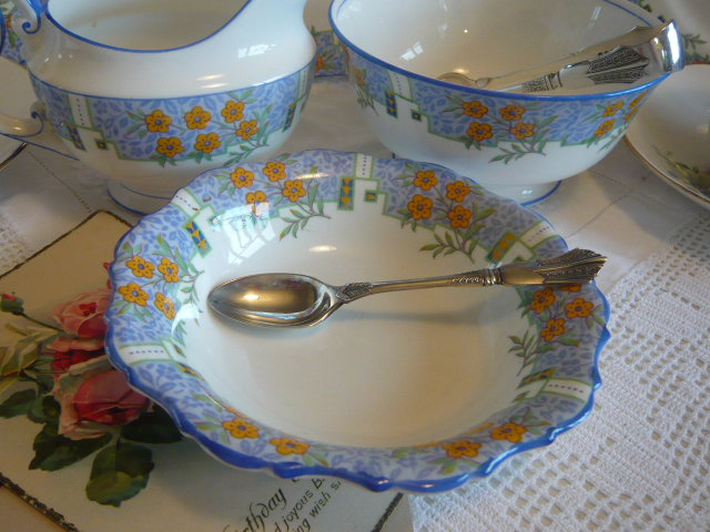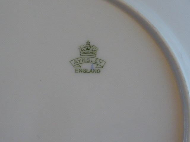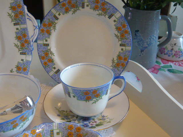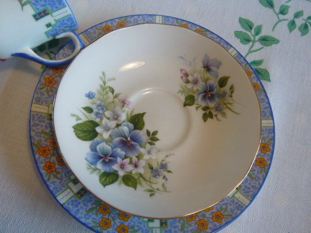 The Aynsley pieces are the blue and orange floral and has the addition of a little dish to use for jam or such at the breakfast table which is a nice unusual touch