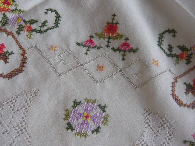 Now this is what I call a pretty vintage table cloth, this is just sooo pretty and simply oozes floral charm, embroidered in pinks, lilacs and yellows,