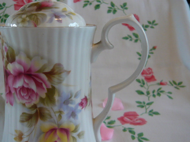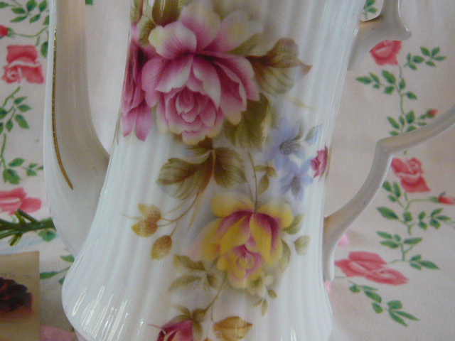 Really pretty vintage coffee pot (or tea pot ) just right for vintage tea times....this is just sooo pretty with roses in pinks, yellows and blues and all edged in gilt