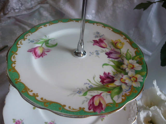 This particular model is a simply stunning 4 tier with the most delightful of plates the bottom plate showing huge bright blooms, one with ditsy rosebuds and stunning green plate of Narcissous by Bell China