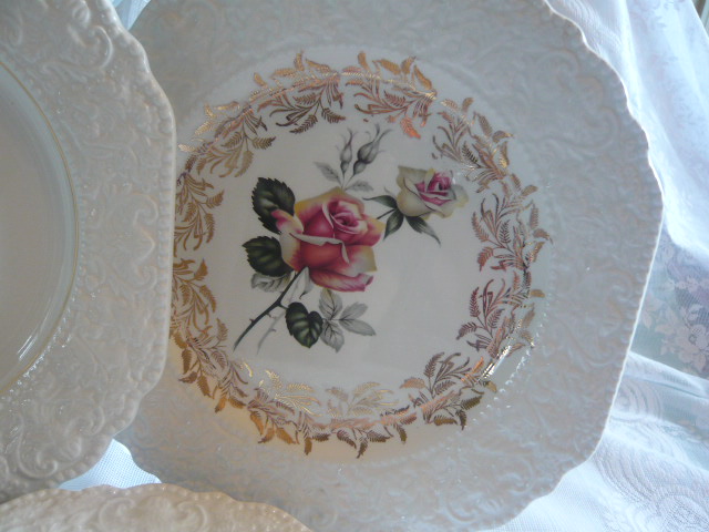 A lovely set of five Lord Nelson roses side plates / tea plates with heavily embossed edges and each plate featuring a totally different rose to the middle these are actually quite stunning in real life photos dont do justice