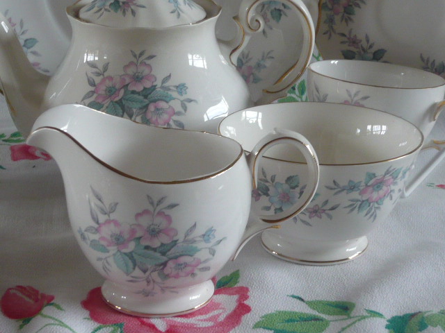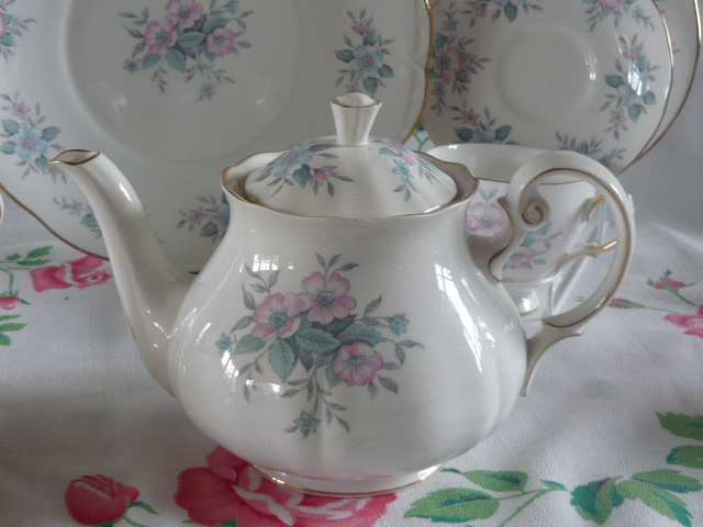 A really pretty vintage tea set just right for vintage tea times....this is just sooo pretty with pastel rose blooms in pinks and blues and all edged in gilt