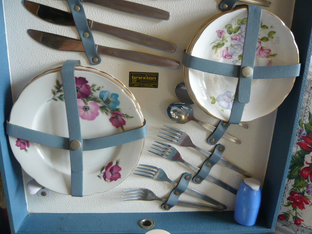 SUPERB VINTAGE MISMATCHED BREXTON PICNIC SET FOR SIX FROM DAYS GONE BY..... great to use now for lazy summer picnics or to take in your vw camper van
