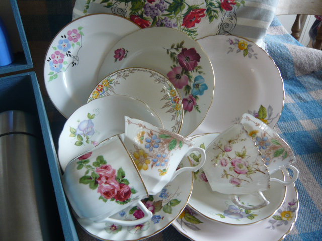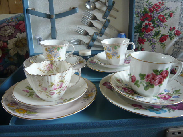 Comprises - stainless steel flask, 2 x brexton sandwich boxes (one has split slightly at the bottom but still useable with a napkin or such at the bottom) 2 x plastic and 1 x glass containers suitable for milk, sugar etc, salt pot, stainless steel mismatched cutlery, adorable mix of vintage china even with milk and sugar
